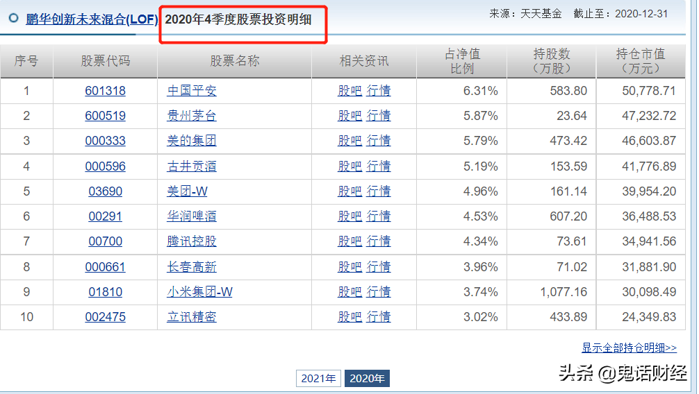 究竟为什么这些基金业绩不佳,又为什么鹏华创新未来会跌得这么厉害呢?首先我们看看这些基金的持仓情况,虽然名字叫创新未来,但是无论是这5个基金中业绩最好的易方达创新未来还是业绩最差的鹏华创新未来,他们的持仓中都不难发现,持股特征和普通的基金重仓股没有什么差别。如果一定要找出差别,那就是易方达的持仓现在以白酒医药为主,而鹏华的持仓以新能源为主。继续向下深挖他们的持仓,更有意思的事情出现了。在鹏华创新未来2020年的持股名单中,中国平安、贵州茅台、美的集团、古井贡酒、美团是它的前几大持仓,也就是说从这个基金成立不久,它所拥有的创新未来这个名号已经被甩得远远的,而之所以发生这样的情况其实并不意外。因为这个基金的基金经理叫王宗合,是一个以消费投资见长的基金经理,他所管理的旗舰基金叫鹏华消费优选,管理年限长达11年3个月,累计收益率270.8%。当时为了发行鹏华创新未来强拉这一明星基金经理来站台,也为后来的亏损埋下伏笔。