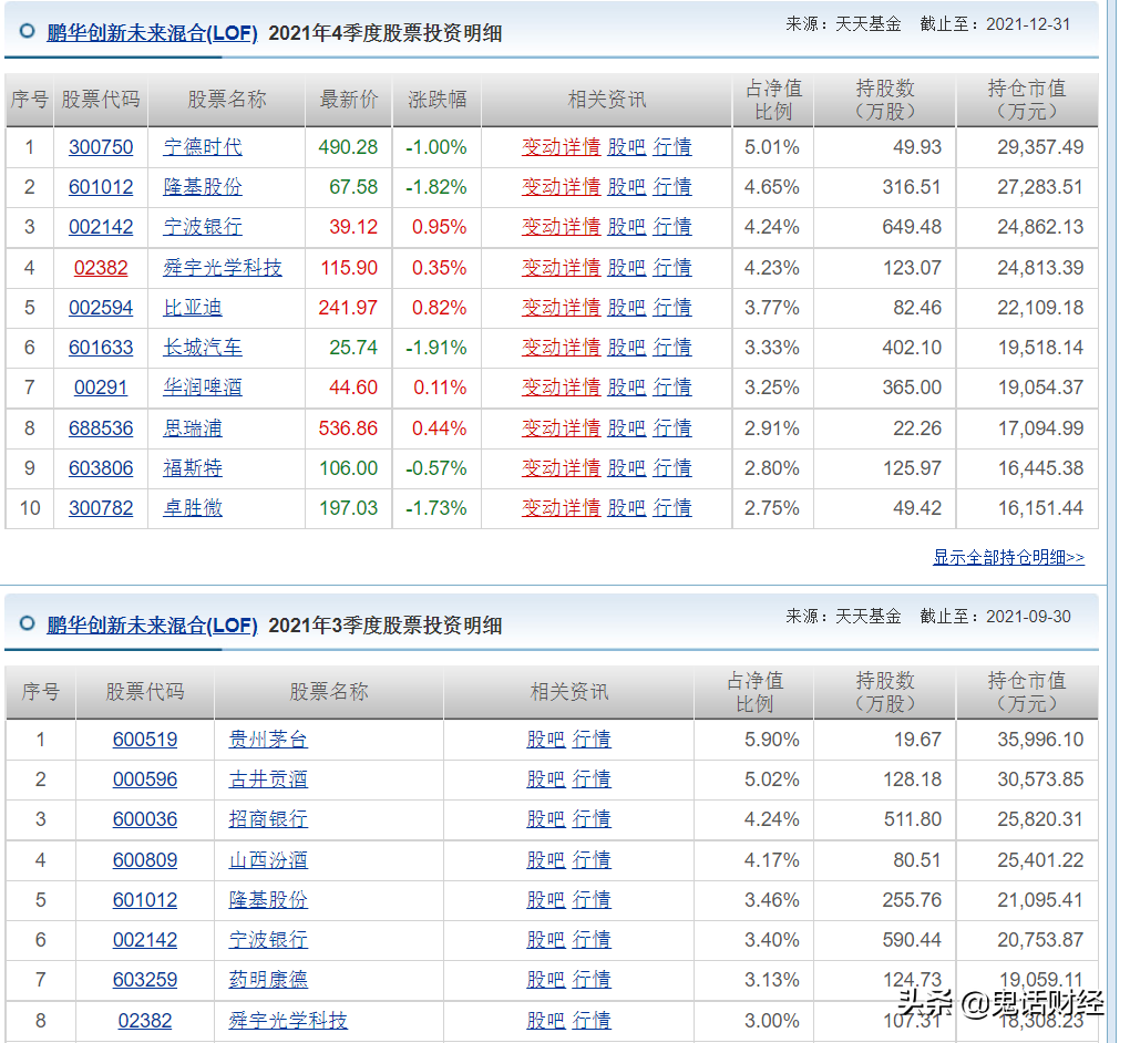 加上王宗合过去2年时间确实也是在走麦城,所管理的基金净值一直都在下降,更惨的是每一次的调仓刚好都踩错了点。例如在鹏华创新未来刚刚发行之后,他的十大持仓中能和创新未来挂上点边的就是美团、腾讯、小米和立讯精密,问题在于2020年4季度那个时候这些股票都处于高点,当时美团的股价在300元以上,腾讯股价在600元以上,小米股价高于30元,立讯精密股价也高于50元。而且随着股价的下跌,他因为看好这些股票还继续加仓,直到2021年3季度这些股票才从十大重仓中消失,而此时这些股票已经腰斩。倒霉的还不止这些,在2021年3季度的十大持仓中我们又发现了招商银行、隆基股份、药明康德,这些股票又恰恰在去年四季度开始了下跌。相信你会感叹,王宗合这几年的运气也实在太差了。