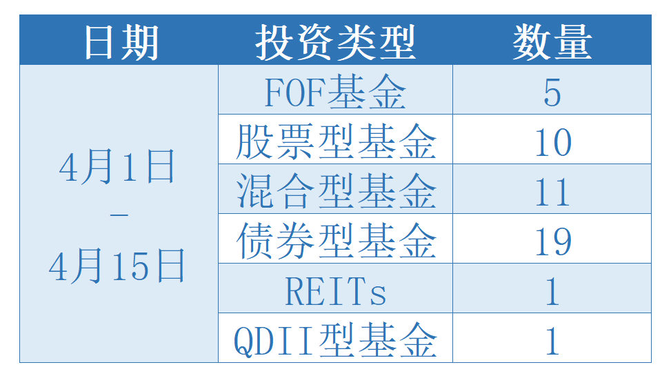 在近期的新发基金中,有5只FOF基金、10只股票型基金、11只混合型基金、19只债券型基金、1只公募REITs与1只QDII型基金。