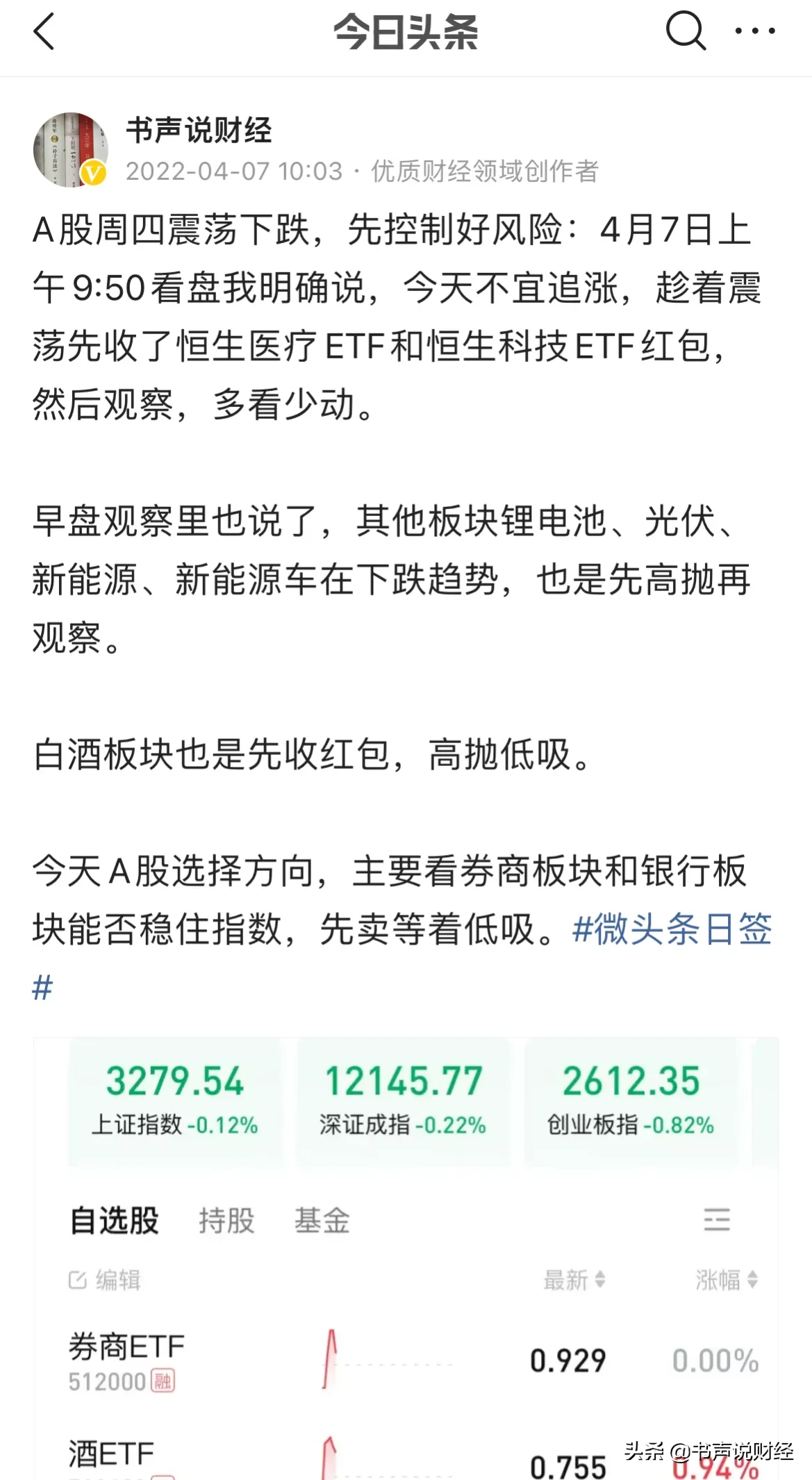 今天为何预判A股下跌,2022年行情如何走:美联储加息、制裁俄国加码、基金下跌基民亏钱……4月7日,今天上午早盘9:50分我就明确预判A股下跌,恒生科技和恒生医疗等收红包,4月初的反弹,比预期的要弱,因为美联储会议纪要在4月7日释放了鹰派加息信号,我及时调整判断躲大跌。
