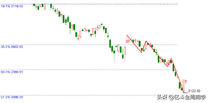 而今,创业板逼近0.618的2100上方,实际上是在2122.32点,那么,创业板见底了吗?请细看下面第二张图: