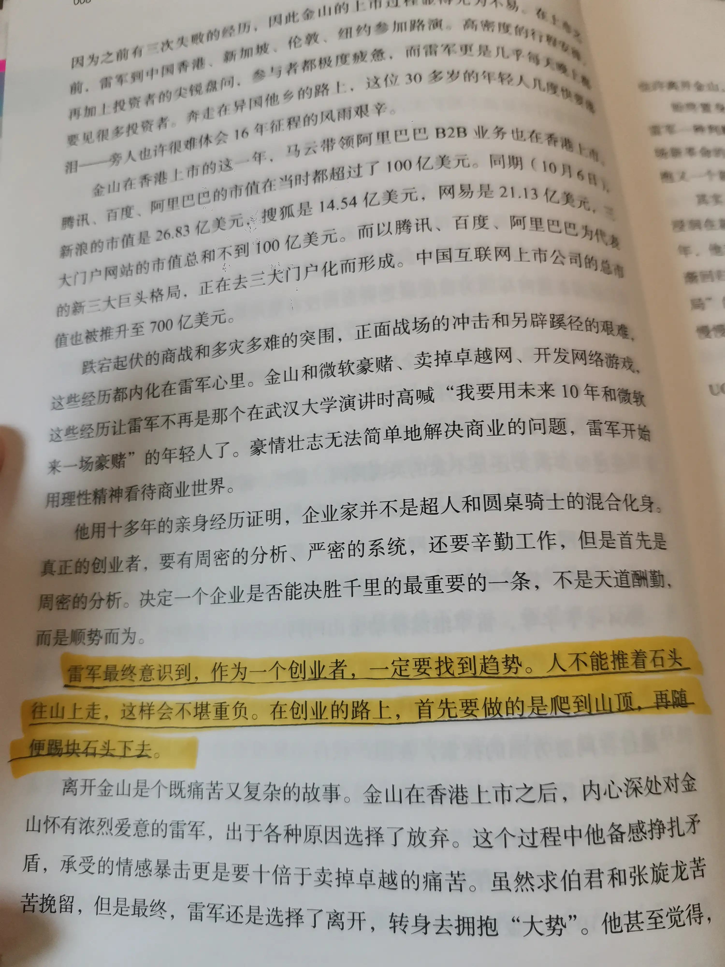 有人说,雷军是普通人靠勤奋能达到的上限,他没有显赫的家世,没有马云超强的经商天赋,没有什么资源背景和强力背书,更没有所谓的什么运气加持,因为他最后悔的是在金山的那十几年只顾埋头苦干,却忘记了顺流而逝,所以走得异常艰难。