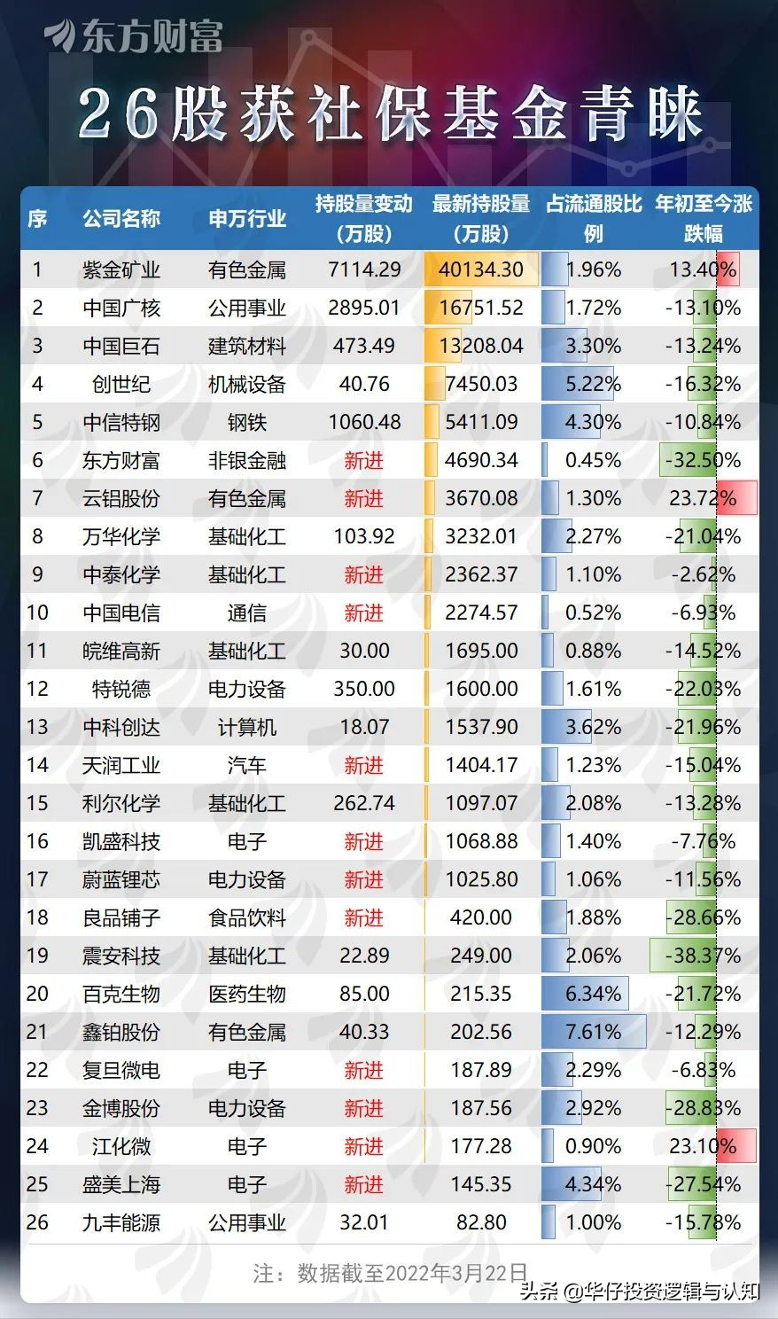 具体个股而言,有26股备受社保基金青睐,其中,14股获社保基金增持,12股为社保基金新进入前十大流通股东名单个股。就增持股数而言,去年四季度,紫金矿业、中国广核、中信特钢、中国巨石、特锐德获社保基金增持前五。其中,社保基金大举增持紫金矿业7114.29万股,截至2021年末,社保基金持有紫金矿业4.01亿股,占流通股1.96%。而紫金矿业今年的市场表现和年报业绩也并没让市场失望,数据显示,今年以来公司股价累计上涨13.40%,2021年公司实现归属上市公司股东净利润156.73亿元,同比增长140.80%。