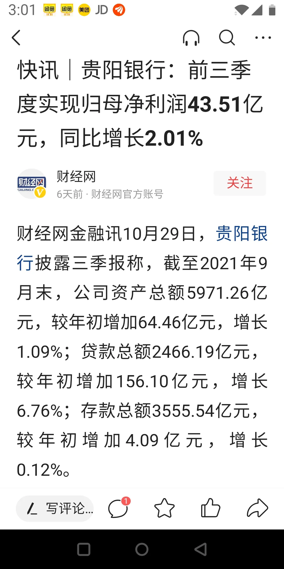 通过对市场的发展趋势分析,随着新股大量高价发行,市场投机炒作的活力越来越弱,大量新股把市场活钱变成死钱。以后80%的股票都成为没人光顾的仙股,投资方向也分三类:一是宁德时代、茅台为代表的抱团股,散户想加入必须冒巨大风险先为他们抬庄。二是热门概念股票轮动炒作,少数高手赚钱,大部分散户去送钱。三就是以合伙做生意的思路,买股息率高的银行股长期持有。贵阳银行前三季度收入109亿,利润43.5亿,不谈每年业绩增长,我自己开公司都没有这样高的利润率。即使合伙做生意也是按固定资产全资投入,而现在只按净资产一半出资,享受全资分红利润,环顾整个国内所有行业,唯有银行股最值得投资。