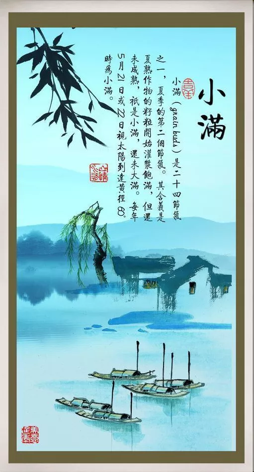 小满,“二十四节气”之一,是夏季的第二个节气。小满,斗指甲,太阳达黄经60°,于每年公历5月20—22日交节。小满节气意味着进入了大幅降水的雨季,雨水开始增多,往往会出现持续大范围的强降水。小满和雨水、谷雨、小雪、大雪等一样,都是直接反映降水的节气。小满反映了降雨量大的气候特征:“小满小满,江河渐满”。另有解释是指北方麦类等夏熟作物的籽粒开始灌浆,只是小满,还未完全饱满。