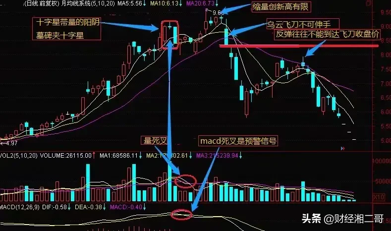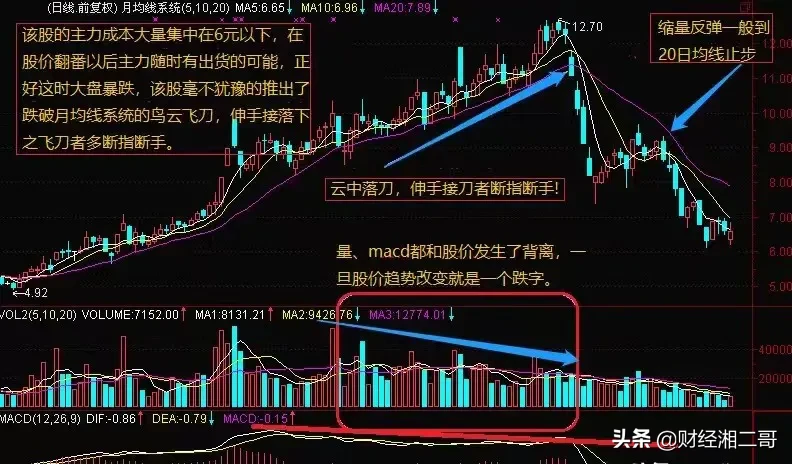 “乌云飞刀”是指股价经过一波上涨行情以后,主力进入了派发的过程,这个时候股价会进入盘整的格局或小幅上涨,当派发得快完时,股票的顶部已积累了大量的套牢盘形成的阴线多于阳线的乌云压顶,当市场股民慢慢反应过来的时候,主力加大派发力度,这时散户、大户都加入卖出行列,于是股价加速下跌,跌破20日平均线,收出一根绿绿的长阴线,优如云中落刀,高挂在空中,其风险是可以想象的,兵败山倒形容这种形态再合适不过了,此时不逃,更待何时!