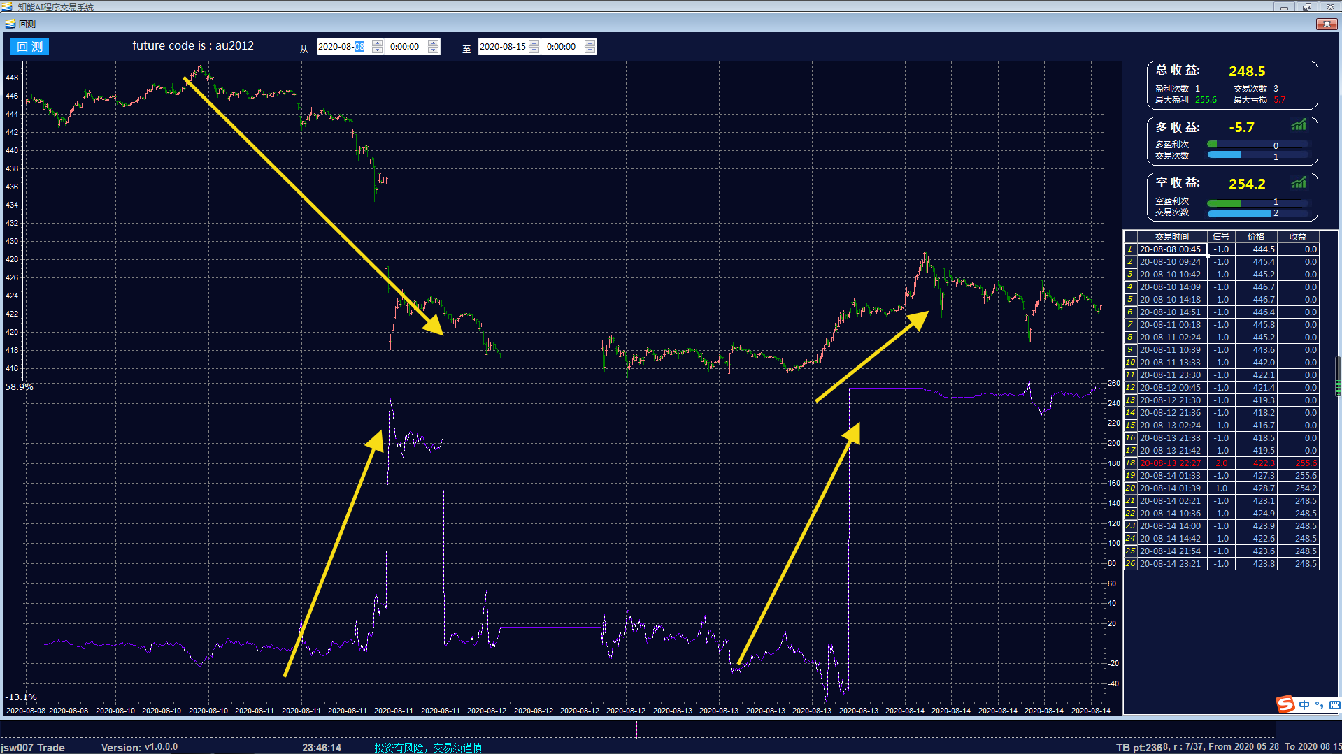 我们现在回看428点,这里就是当时的高点, 电脑自动能在高点出来前先把空单平仓,然后不操作,等待高点出来,等高点出来了先试错,看看行情是否稳固,然后再下手。这就证实咱们是电脑算法模型,不是普通技术指标组合搭配,不同于大家所熟悉的其他量化模型软件。