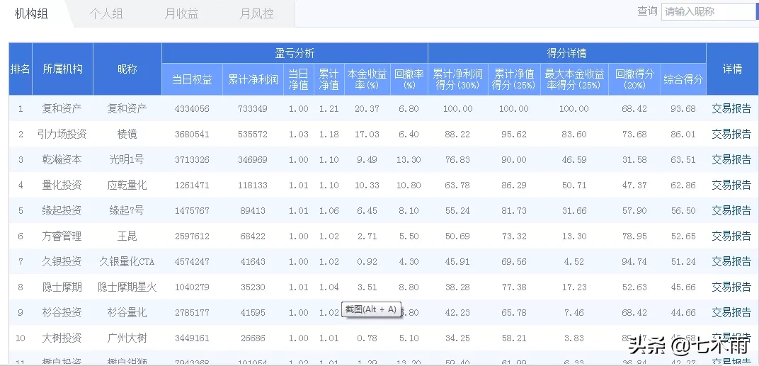 4.到目前为止,开赛已经一个多月,机构组能够保持正收益的有12家,占比约60%多,第一名是复和资产,资金收益率20%。在个人组,能够保持正收益的有56人,占比约40%,本金收益率最高的是44.9%。
