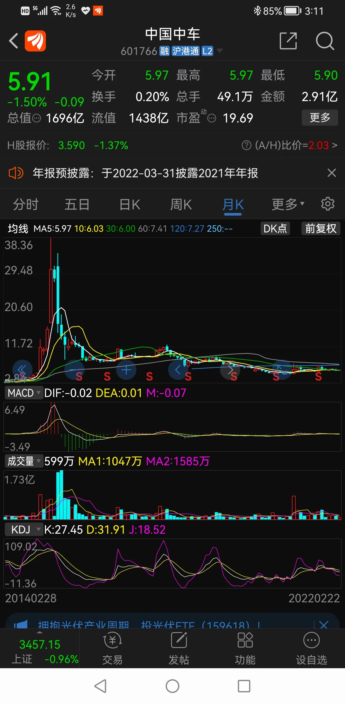 中国中车这个股票拿了4年多了,买入的时候是2017年10月。当时买入基于3个原因:一是刚入股市,没有风险意识,觉得从日线看呈现上升形态,从月线已经跌了两年多,主力一旦拉升会有相当涨幅,甚至认为会涨回15年高点。二是东方财富股吧中有一个人一直鼓吹出现了金蛤蟆的状态,说马上会起跳,由于没有相关知识,错误的相信了,所以买入,(到现在也不知道这个发帖人是不是主力砸盘出货的“托”)。三是觉得中国就这一个做火车的股票了,具有稀缺性,迟早拉升应该问题不大。