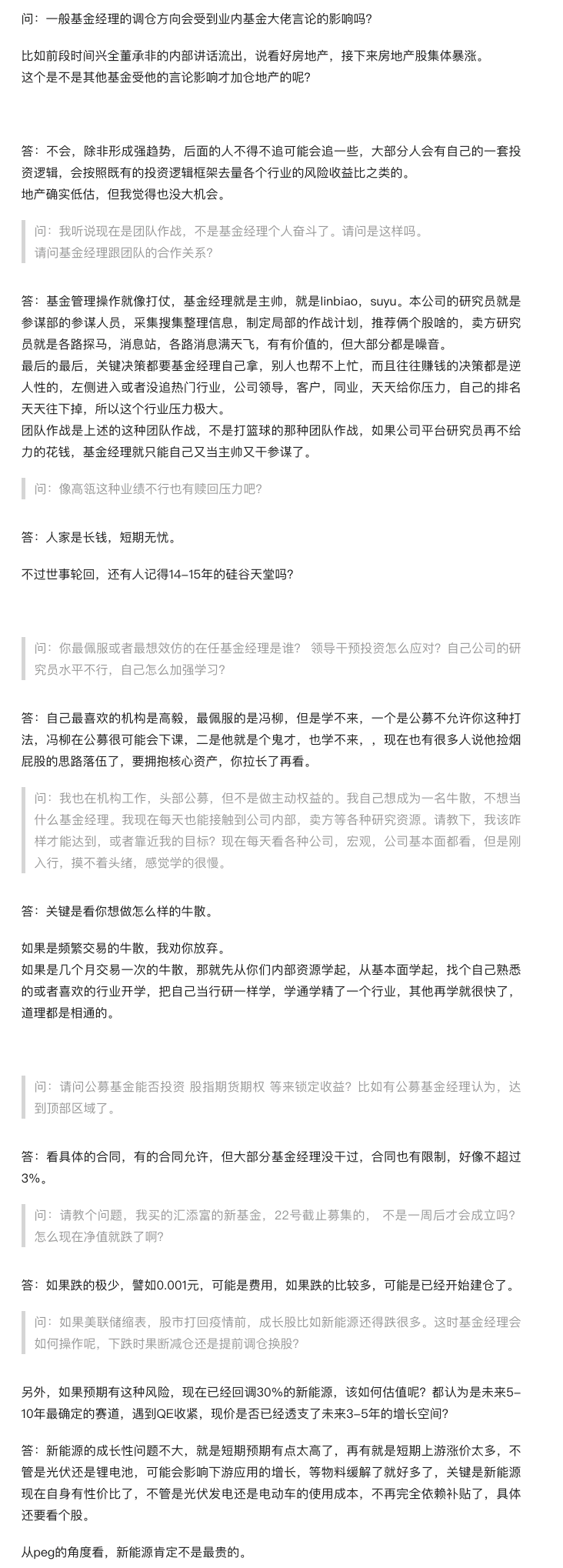 如:抱团现象、基金经理的年薪及考核、2021年板块热点展望、基金净值及调仓等等问题。