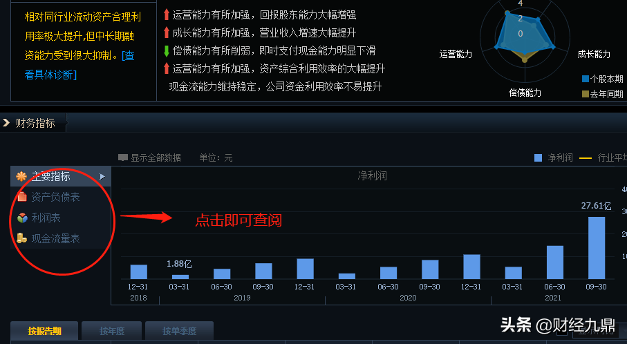 主要分析三个点,现金流、负债、利润。现金流充足的,说明公司具备较大的发展空间,有能力投入,整体运营压力不大。相反负债率过高,就要注意了,说明公司在出现某些意外的情况下,容易导致资金链断裂,直接影响到正常的运营。利润不需要太高,主要是能否持续增长,所以关于利润这一块需要特别注意,炒股是炒预期,假设某公司这个季度的业绩特别好,其实往往此时的股价已经是有一定涨幅了,而公司面临的下个季度能否持续增长的压力也相对变大。所以公司业绩处于持续增长中变可,这样说明了处于相对稳定的发展状态,之后的预期才有盼头。