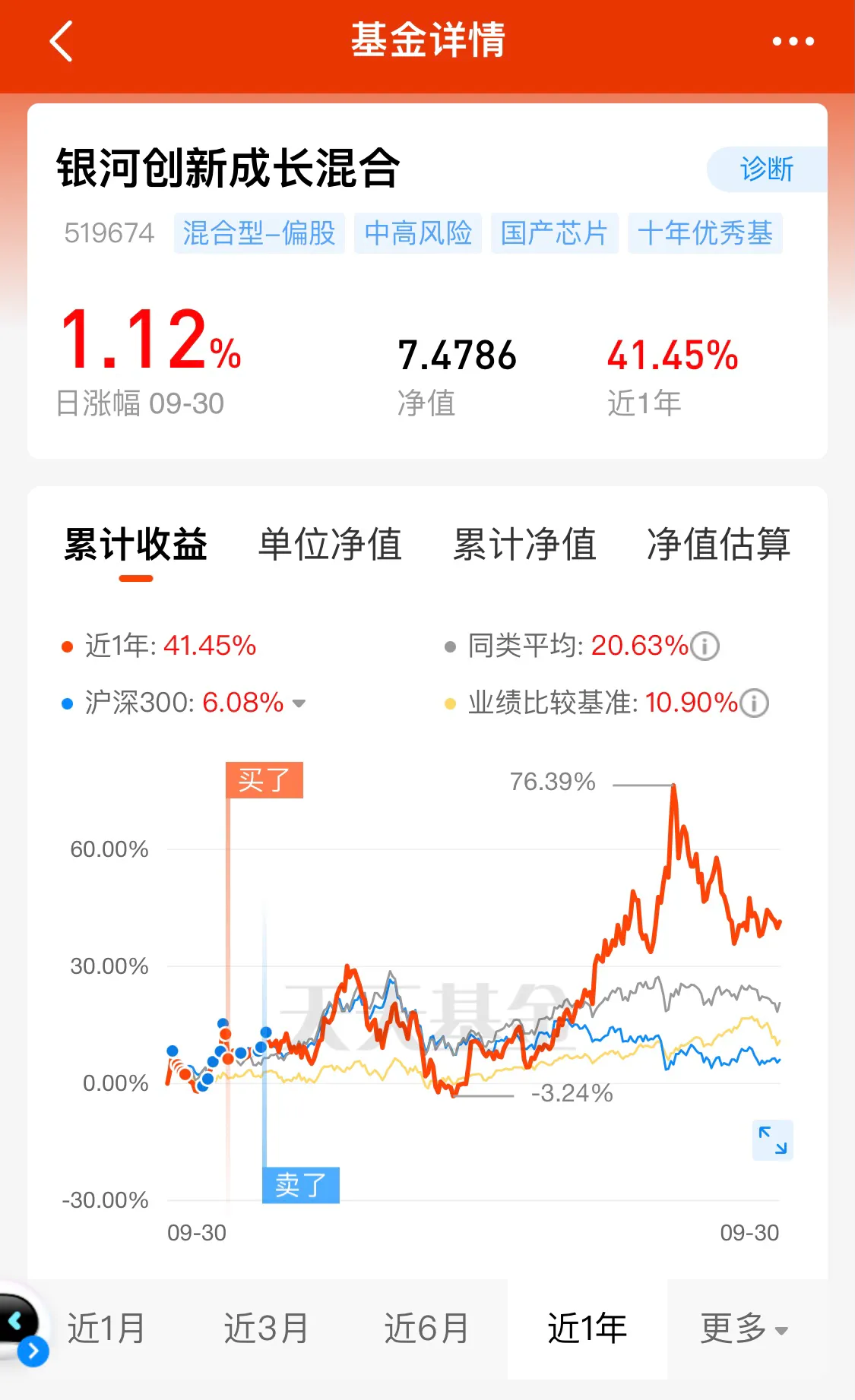 【银河创新成长】十年涨幅764.28%,近一年涨幅41.45%,混合型基金,近几年股票比列偏高,持仓股票94.64%,且以科技股为主,规模147亿。