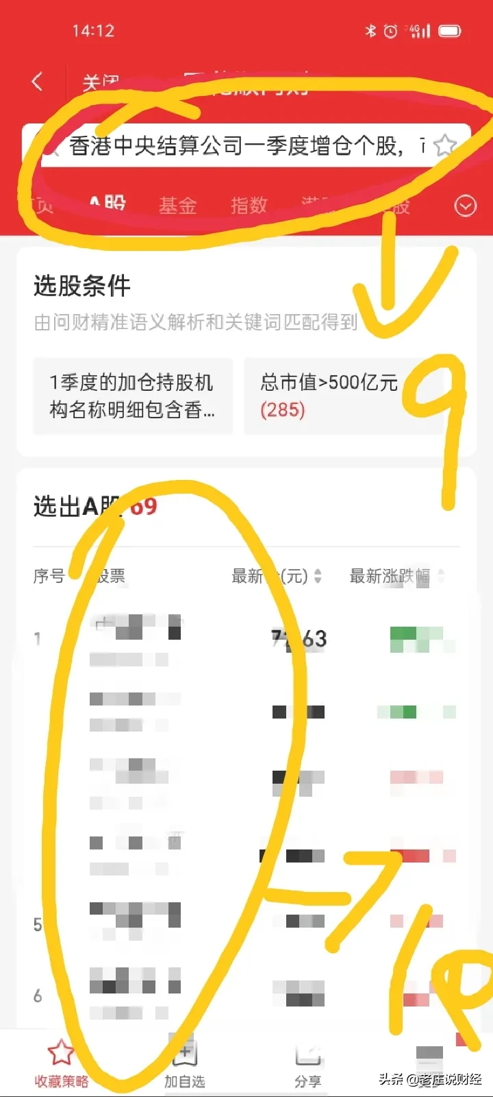 1点击交易软件上的问财在输入栏输入我们找的个股的问题,例如:香港中央结算有限公司一季度增仓,加市值大于500亿的个股(我个人认为市值越大的个股,投资越稳定,避免被大资金操作的风险越小)按搜索我们就可以轻松的看到下面这些就是我们需要的答案。