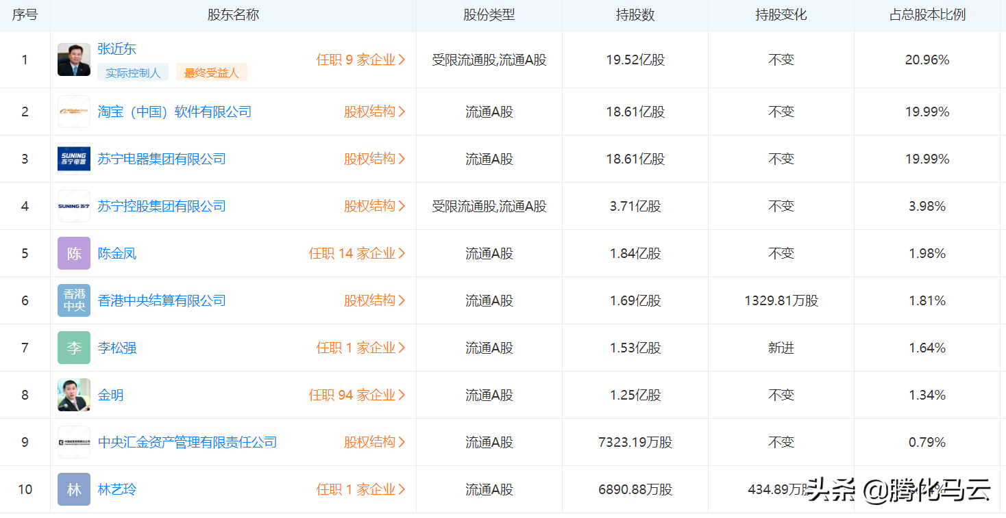 张近东,实际控制人、最终受益人,受限流通股、流通A股,19.52亿股,占比20.96%;