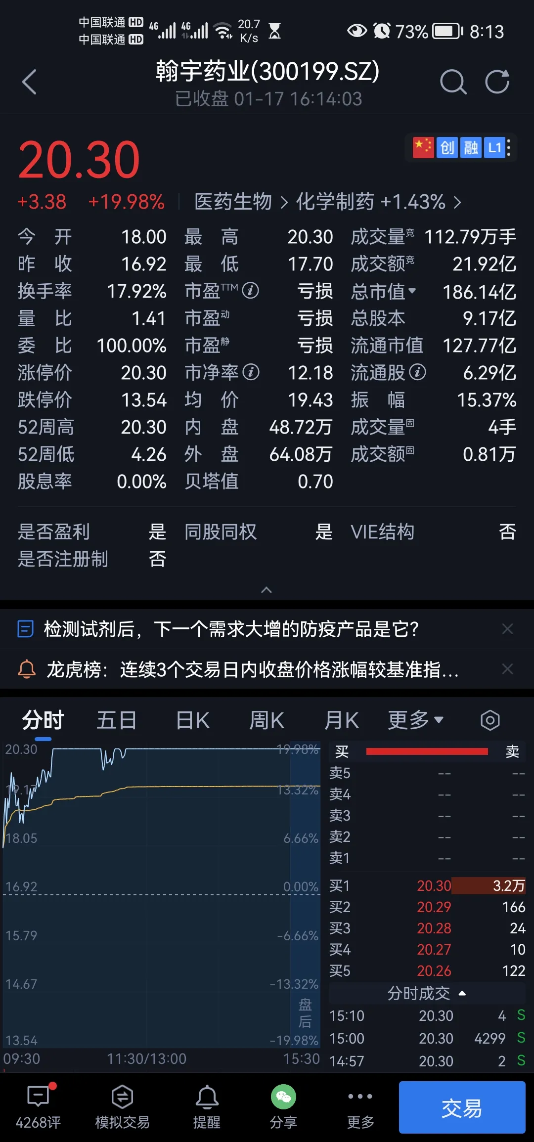 今天大盘普涨,中药板块至少微微上涨。但是翰宇药业高开10个点后又是20cm涨停,翰宇药业连续20cm二连板,完全成为市场闪亮的明星啦。300199你做到了,表现真的好惊艳,完全超过了红日药业,陇神戎发等前期明星股!翰宇药业为什么会这么强势呢,且听分析。