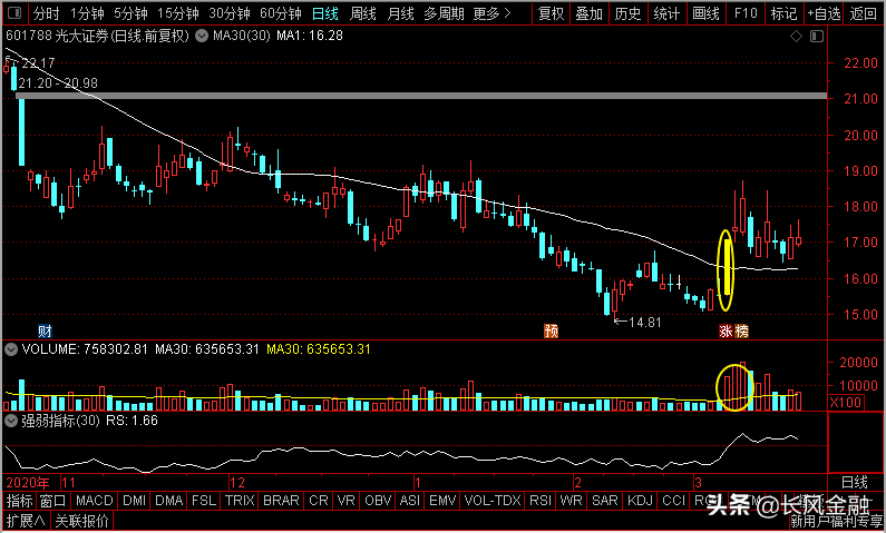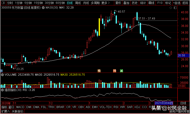 先来看东方财富,东方财富从之前最高的40元上方,一度回调到之前最低的27附近,中途几乎没有像样的反弹。今日东方财富已经回调到了前期的起涨点附近。但目前作为趋势指标的30日均线依然明确向下,趋势识别为下降趋势。目前的上涨,不能当做是新一轮上涨的开始,还是暂时做反弹看待。
