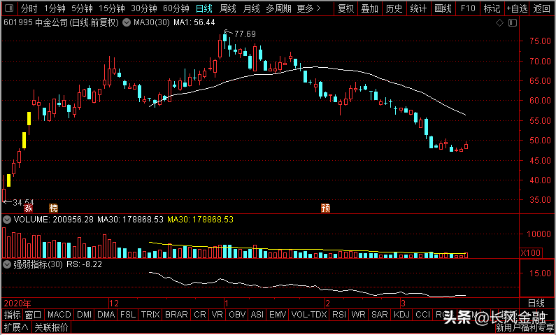 中金公司上市首日即是最低点,之后价格连续拉阳线,一时风头无两。但目前价格仍然没有见底信号,价格处于30日均线下方,均线也处于持续下降状态,下降趋势阶段特征明显。静待价格回调到位,等到后续30日均线由下降转为走平,则是底部企稳迹象。