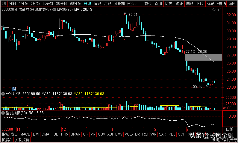 中信证券,最近几天也有反弹迹象,但反弹无力且也没有量能的配合。目前30日均线下降,价格也一直在均线下方运行。目前所有的上涨,都只能做反弹看待,目前中信的前期横盘整理在20-24附近,价格现在已经跌回到前期的横盘蓄势期,静待时间企稳。