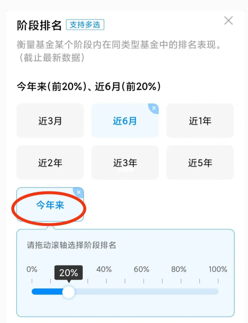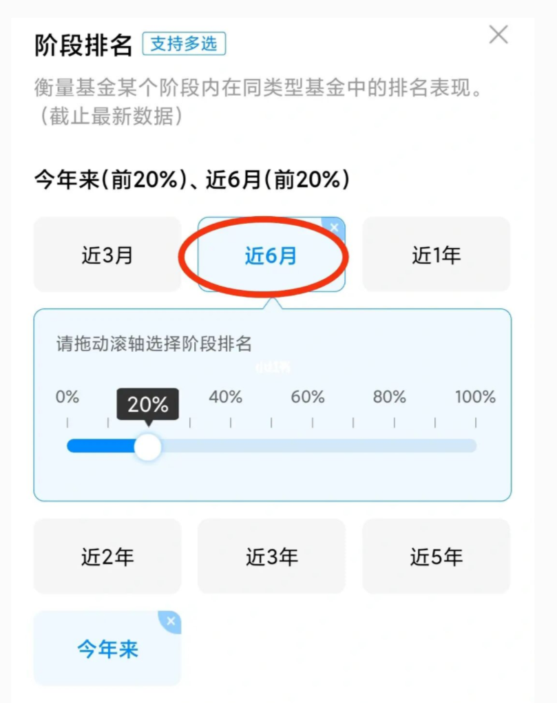 6)阶段排名:我用了2个条件,1个是今年以来,1个是近6月,都要求排在前20%。为什么加了近6月?因为很多上半年表现好的潜力选手下半年都不行,所以我要排除这些人