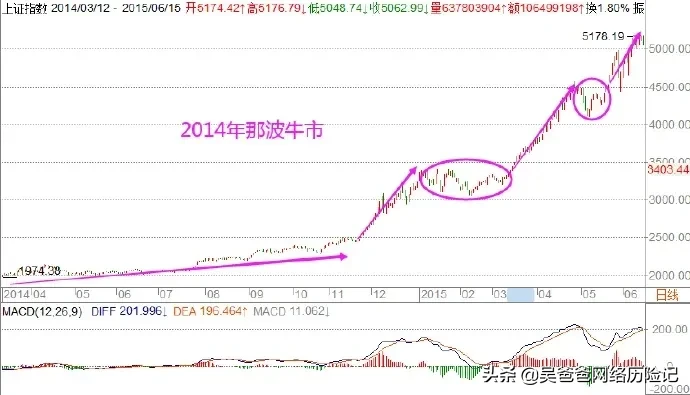 第二张图:是2014年牛市的全景图,跟07年一样,也是先碎步小阴阳走了很久,其实碎步小阴阳就是吸筹继续能量的过程,然后开启第一波牛市,牛市途中指数横盘震荡,对应MACD的DIF回归0轴,在0轴附近掀起第二波牛市,完美复制了07年的牛市节奏;同理,第二波牛市到第三波上涨之间,并未完成DIF充分回归0轴,结果,创造了5178点大顶;