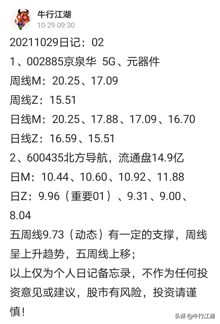 5、600435北方导航,周五收阴线,但五日线未破,最低9.93,与周五的数据9.96基本吻合,它的周五最高价10.42与周五的日线第一目标位10.44基本吻合,既然遵守技术规范,那么后面可以逐步跟踪,如果持有的可以以9.96为止损止盈位,不破就继续持股即可!