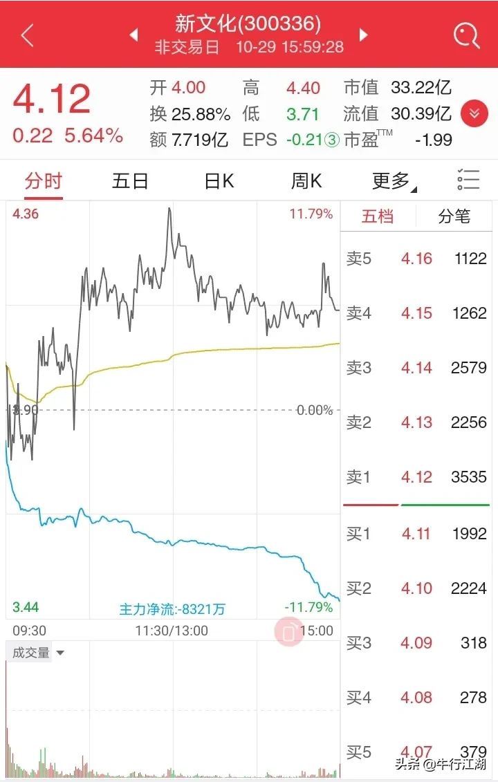 2、300336新文化,近期强势,受元宇宙题材追捧,属于低价题材股,业绩面无实质变化,周五给出的4.10目标位已到,并最高距离周目标位4.60仅差0.20元,最高价4.40元,收盘价刚刚好在4.10附近(4.10元)。元宇宙概念感觉会反复被拿出来炒作,Facebook脸书都已改名,更改虚拟现实LOGO,说明虚拟现实相关技术被一些大玩家非常看好,这类的企业谁也不知道下一个谁会是华为?谁是小米或腾讯,所以概念炒作对资本运作来说,这种迷雾般大家都看不懂的,其实是资本最擅长的,新文化,汤姆猫,宝通科技等这类题材,如果在投资者认知内可以尝试参与,假如不懂,一定不要在涨幅之后参与,仅可在大势不好的时候潜伏(这也是对前几日大盘回调之时的潜台词,越是大盘调整越是提供一些潜在目标上车机会,一旦上涨错过了那就等下一次机会),新文化这类题材个股仅适合高抛低吸。