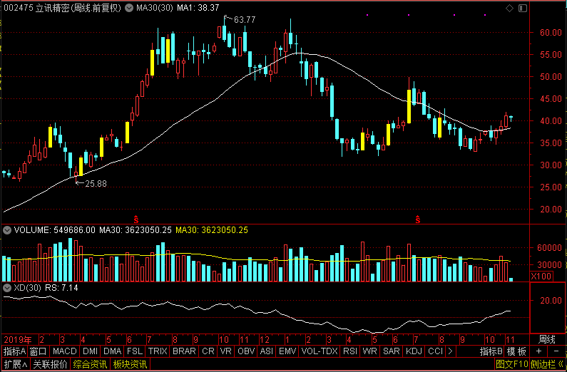 立讯精密,今年年初已经经过了一波明显的下跌,而在接下来这几个月里,立讯精密已经不再创出新低,开始横盘整理。已经持续超半年了。
