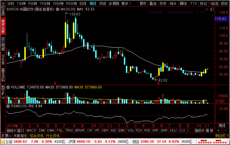 从走势上看,中国软件最近两年已经从129的高点,跌到了阶段性低点42附近。之后,中国软件就开始了持续的横盘整理过程,持续时间已经近一年时间了。