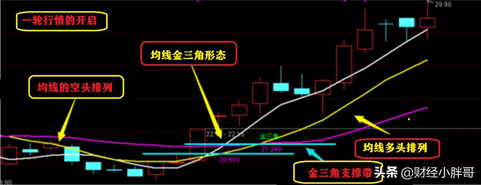 1、股价长时间下跌后期,首先5日均线上穿10日均线,再同时上穿20日均线,形成“金三角”形态,这个时候价托也就形成了,这个形态说明股价已经有止跌的迹象,我们可以开始关注;