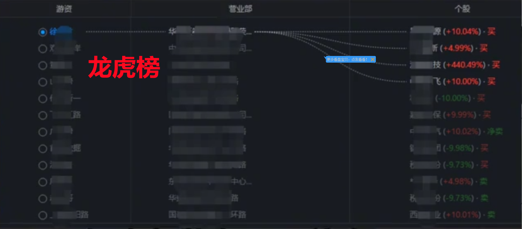 9:龙虎榜。每天收盘后,下午四点半左右龙虎榜数据就出来了,点击软件界面上面的龙虎榜,你可以看到知名游资和机构的动作,买了什么,卖了什么,去钻研他们的操作,比你自己选股会强很多。