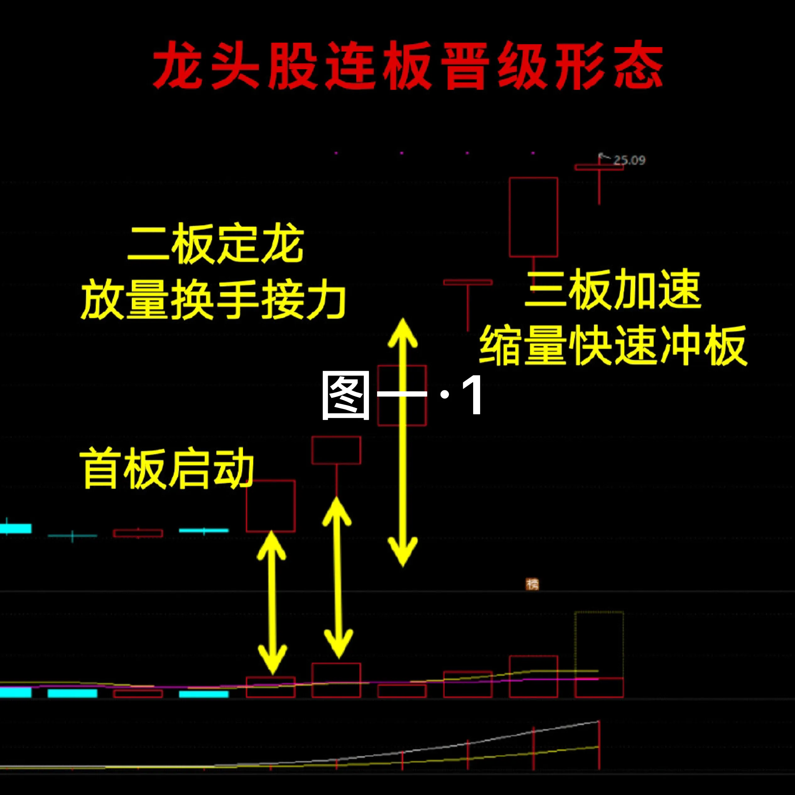 1、龙头股的连板晋级形态(图一·1):若个股的首板启动时缩量,继而二板迅速定龙头且温和放量,三板快速缩量冲板,此时可以介入后市看涨;