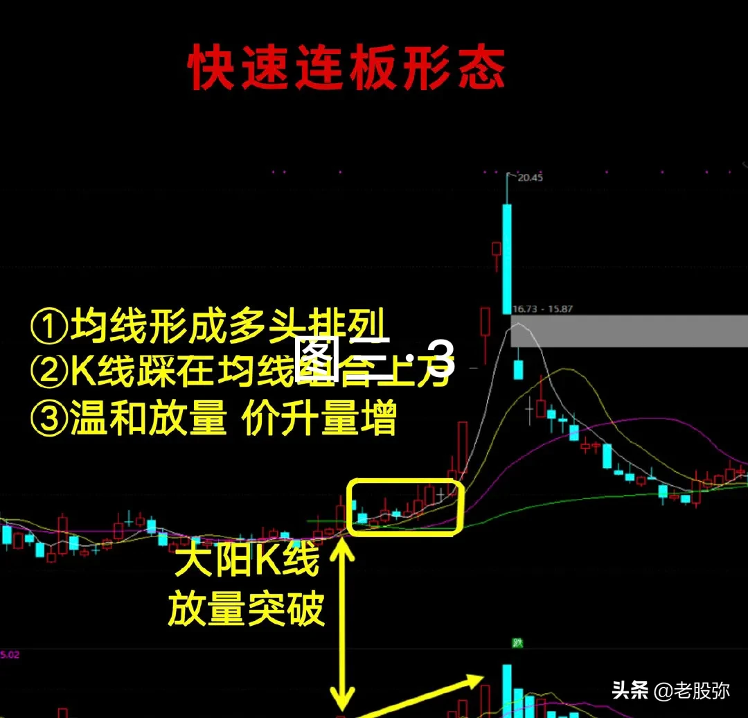 3、快速连板的形态(图一·3):个股若从低位横盘整理很久,这时启动进行一个快速的连板,且均线形成多头的排列,K线踩在均线组合上方继而温和放量,价升量增,此时介入后市依然看涨有空间。