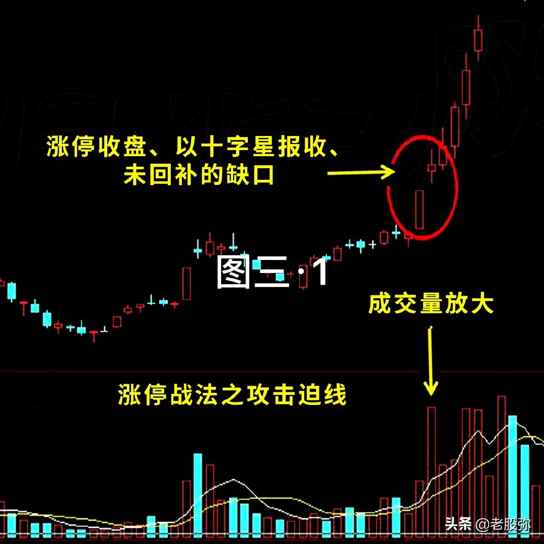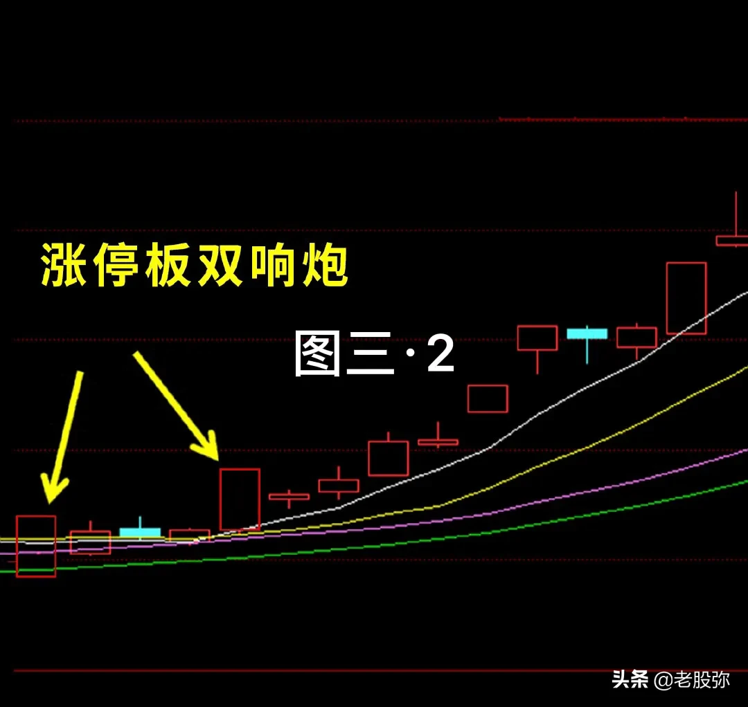 第三:涨停战法之攻击迫线(图三·1):个股开启涨停后,第二天跳空高开且出现十字星收盘又未回补缺口的话,可以放心介入,此时观察成交量也是放大的,后续还有上涨的空间;若个股在稳定爬升的过程中出现涨停双响炮(图三·2)此时也可以介入,后续上涨空间大;若个股在爬升过程中出现”天高云淡”的形态(如图三·3)此时介入后市看涨。