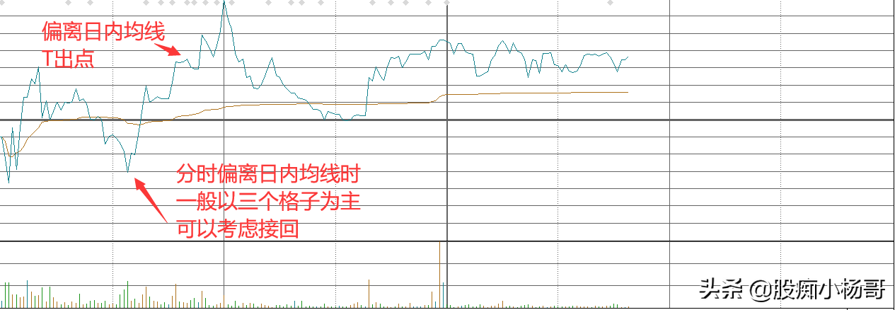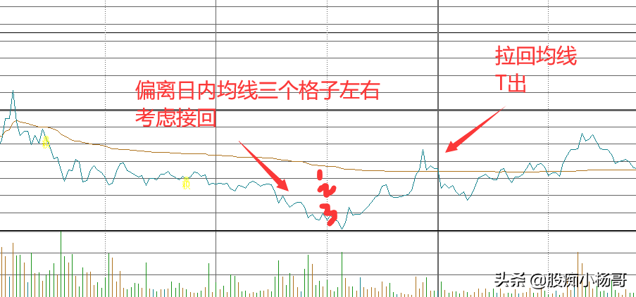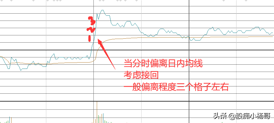 2,大多数个股对于均线是依赖的,因为均线是日内的平均持有价位,当股价偏离日内均线太远,会有一种引力拉回至均线附近。这种偏离,称之为乖离率,不管是向下偏离还是向上,原理是相同的。我们可以根据软件上自动分好的格子为标准,一般以三个格子为标准。