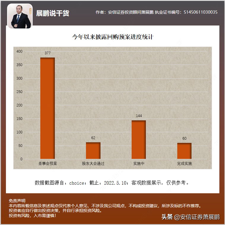 最后看看实施的进度,年初披露的公司较多已经实施完毕,合计有60家,回购金额超过30亿元。实施中的有144家,通过股东大会准备实施的有62家,还有377家通过了董事会,等待股东大会通过,后续可以继续关注。