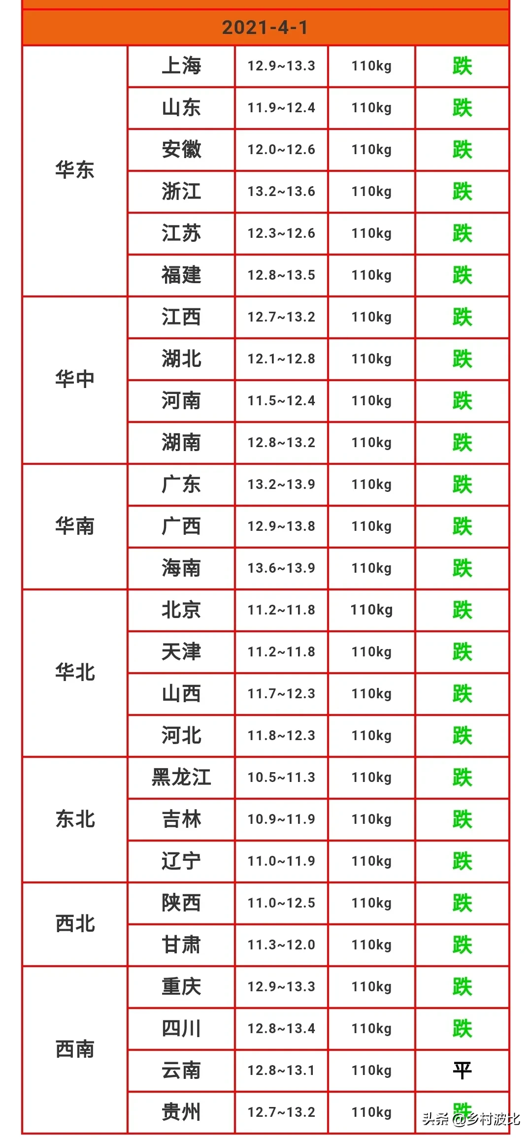 #猪价# 下图为2021年4月1日全国各地生猪价格表,可供参考: