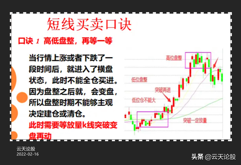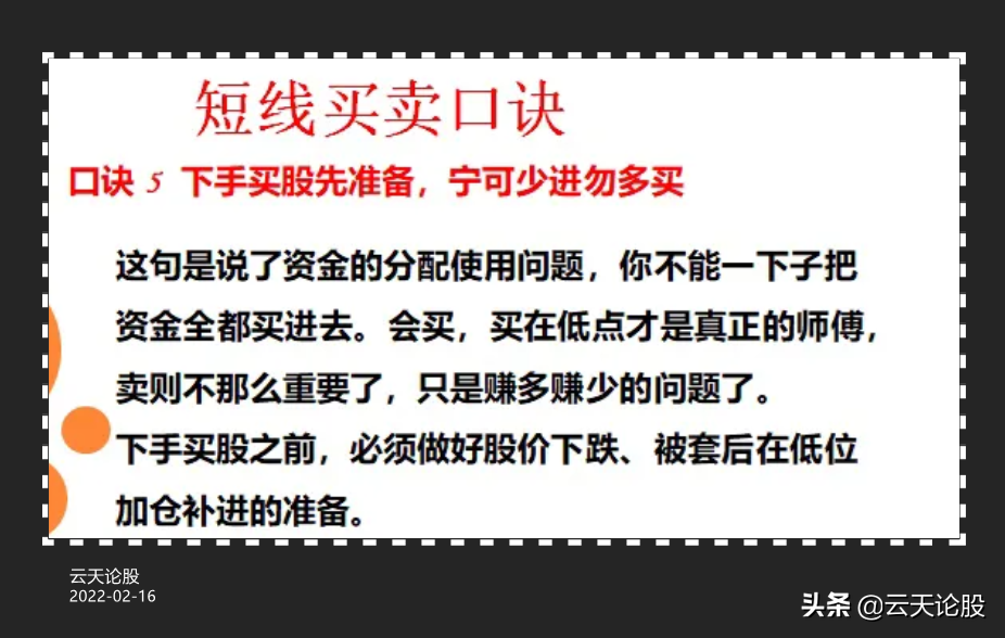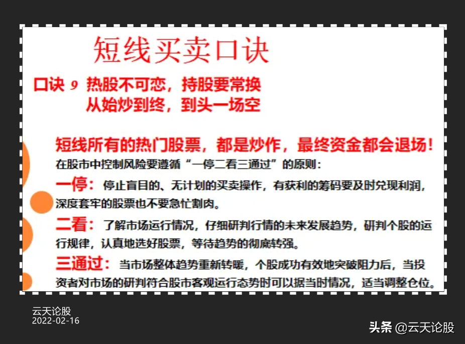 技术方法有千万种,想要掌握必然是要耗费一些时间,但是即使掌握了方法还不够,还要将其准则严格的执行,市场是留给有准备的人的,我们要敬畏市场也要懂得节制,只拿我们能力范畴之内的利润,不是我们的我们也不要强求,为了方便大家理解我把老前辈的短线9大口诀制作成了图片,把这9张图收藏捂出明白,相信你在股市中也能更胜一筹。