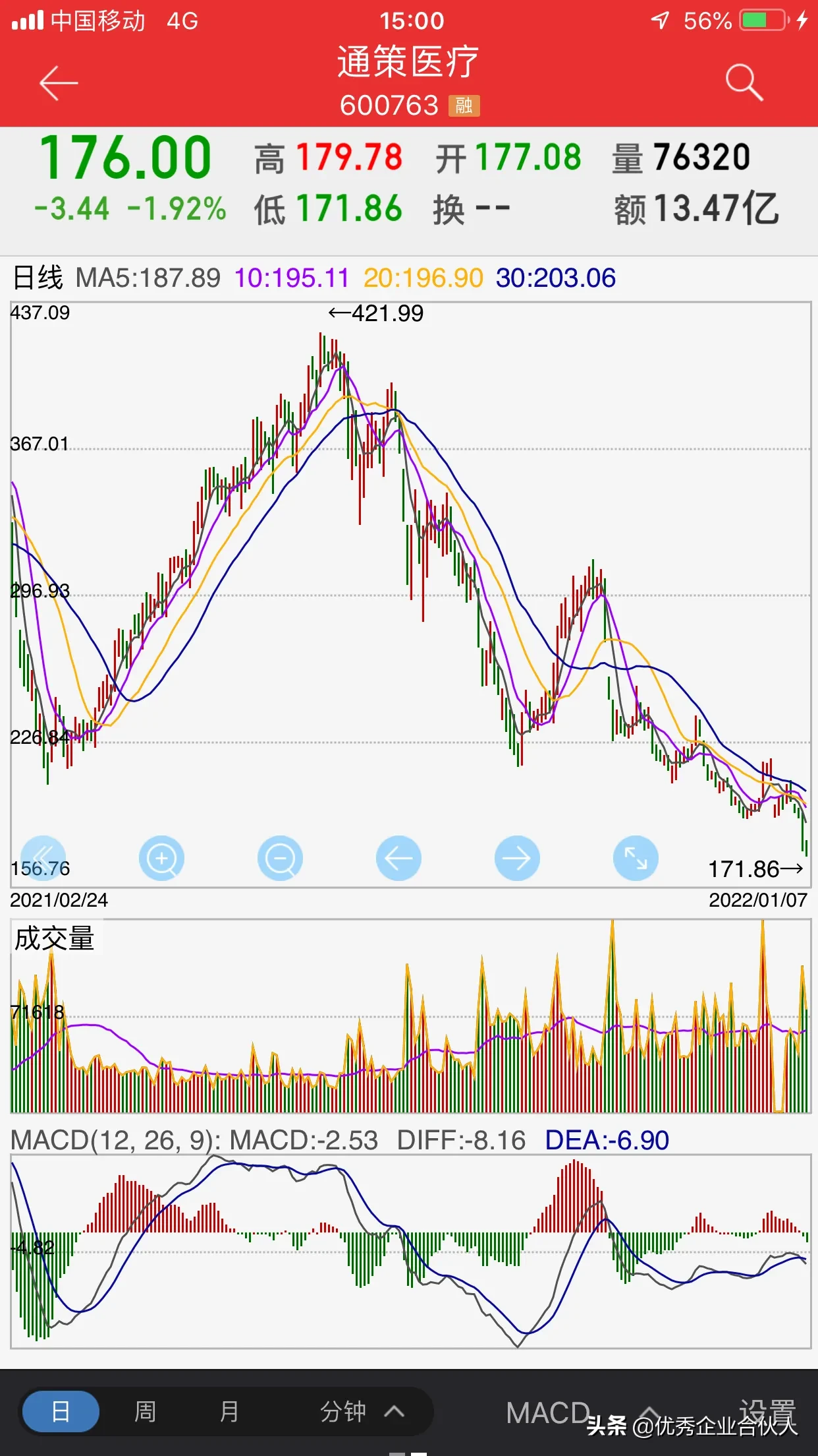 “树高不过天”,是泡沫早晚会破灭。到了顶峰,免不了就是下坡,只是下坡来的更猛烈。仅半年时间,通策的股价由去年6月29日的412.99高位就调整到了今年1月7日的171.86,是不是底部?我看不像,现在通策的市盈率还高达79倍,远远超出沪指深平均水平,也就是半山腰位置。
