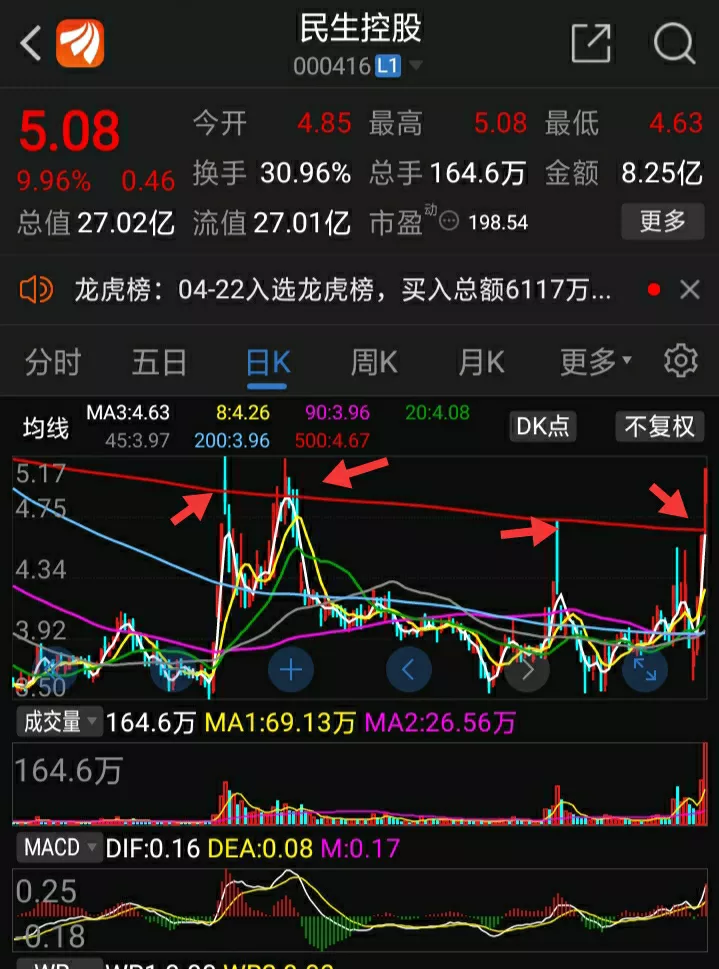 成妖成龙不易,首先技术上有严格的要求,其次要和资金持续介入有强烈做多意愿。民生控股本来是一个熊股(我把长期在500均线之下的称熊股),本来想要由熊转牛是一个漫长的过程,不甘心的主力会想方设法把股价往这条线上拉,由于距离远过早消耗了体力故500均线就像是高压线触之必死,于是蓄力后再试再死,如此反复。何时成功呢?我总结归纳了一句真言:一不涨二不过三虚晃四突破。突破并站上这条牛熊线意味着打开了一片新的天空。见下图民生控股是否经历了四渡赤水本周五才站上这个难以逾越的天堑?操,也太难了。是的就是这么难,可经过不懈努力还是成功了。此外,左边的那根大阴线也是一道必须踩在脚下的坎,周五也实现了。那么接下来是第二个问题:主力资金流入做多意愿是否强烈。它第一板小量快速拉板封死板,第二板前大半段股价贴着0轴线窄幅震荡像是睡美人,下午开盘不久火箭发射带量上板封死板,成交量放大做多意愿坚决(见下图分时图)。值得注意的是三板,跳空高开略微冲高后快速回落企稳后迅速拉板,在回落时留下了一分钱的跳空缺口,缺口是强势特征之一,很少有龙股妖股没有跳空缺口的可以说跳空是超强股走势的标配。本来民生之强无可置疑但盘中的反复开板以及成交量的急剧放大全天换手31%,咋看确实量大了有主力不断开板出货的可能,可是在当前的极弱市场环境下虽然有散户高位买进但更多的应是当天落袋为安,龙虎榜卖大于买也说明不了什么,因为这都是明面的东西看不见的分户操作主力不想让人看到那肯定是看不到的,诡异的是最后集合竞价1,5万手以涨板价成交而最后买一上的买单夸张的显示5,3万手,显然这是有主力在最后集合竞价阶段用巨单扫掉了所以卖单,余下5,3万手因无对等卖单而空挂在买一上。结论:1,周五成交量虽大但仍然是头天的倍量弱,应该看做合理的成交量。2,四渡赤水之后带量涨板突破并站上500均线天堑并将左边拦路虎长阴线踩在脚下应该是真突破。但以上这一切都是分析,主力是否接下来强力做多那只有市场一个试金石:下周一开盘一字板或秒板就可能成妖,反之就不是妖,不妨拭目以待(本文只为相互交流提高分析能力不做任何推荐依据)。