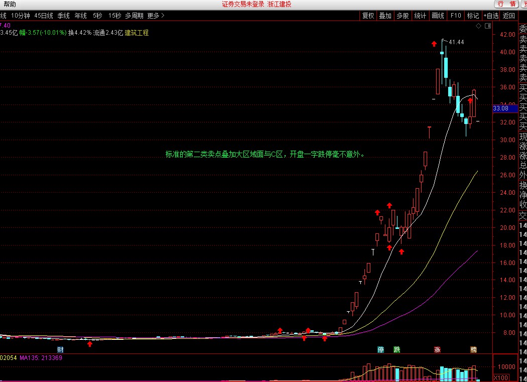 应该说他们的分析都有一定的道理,但不是明显充分的理由,因为大级别题材龙头走出第三春行情的个股在历史上也为数不少,比如几年前的漫步者、特力A等。通用电气前总裁杰克.韦尔奇曾经说:没有任何的细节不值得你去挥汗如雨,也没有任何的小事不值得你去精益求精。就浙江建投的具体细节表现来说,我们仅仅通过均线系统的变化态势就能够完全预料这个开盘跌停的出现。首先我们回看该股去年12月20日那一天,30日均线第一次上穿60日均线,从而形成了这波猛烈行情的多头时空区域面,后面其龙妖表现一直在该区域面的不断延伸之中,随着三均线多头运行的面积累积,伴随的风险也是越来越大,但始终没有出现C区的明显见顶信号,直到3月31日第一次形成标准的C区,也就宣告了该波多头区域面的终结,因此昨天的一字跌停亦是理所当然。