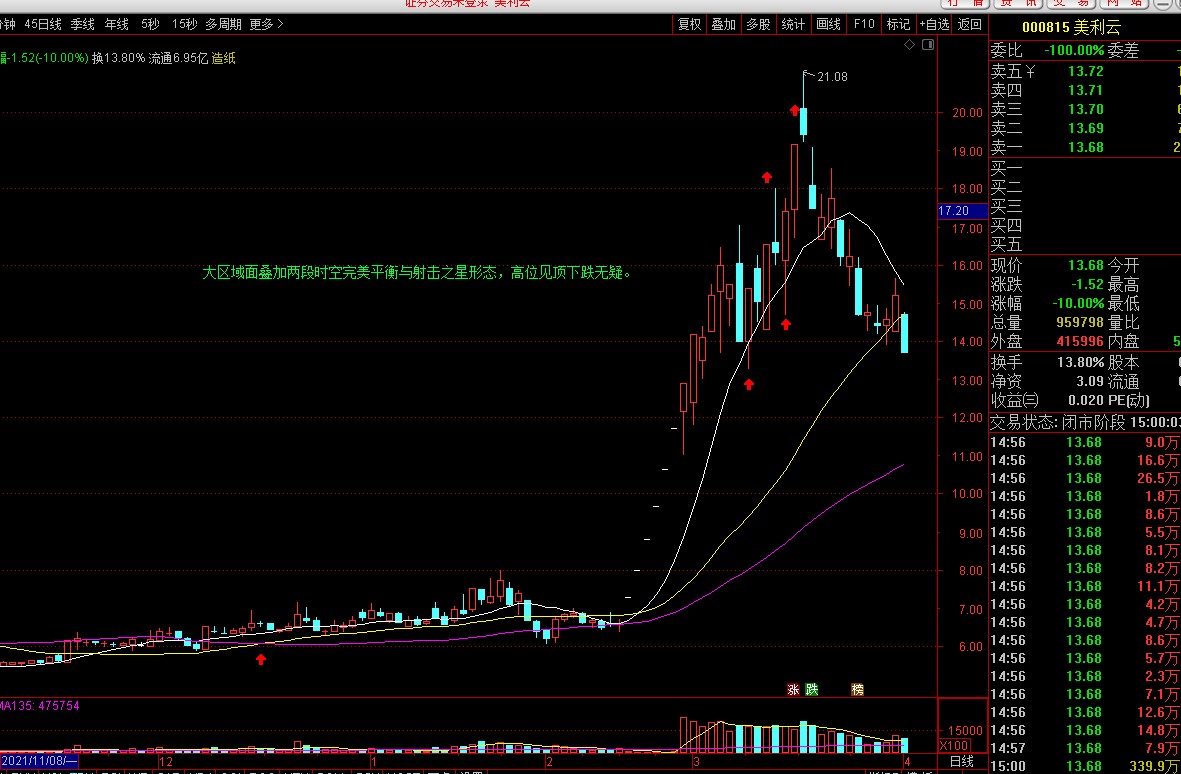 由于均线系统天生的滞后性,C区往往对应了某级别走势类型的第二类卖点,我们在临盘时切不可傻傻分不清它们之间的关系,唯一的操作依据当是均线K线量价多方印证,这样就不会无从下手了,最后把盘面买卖点深深地刺入自己的头脑之中,一切操作皆以它为准绳,如此我们就不会迷失与惆怅,从今以后你也能在市场上呼风唤雨了。同时附上中国医药与美利云的见顶解析图,如下所示: