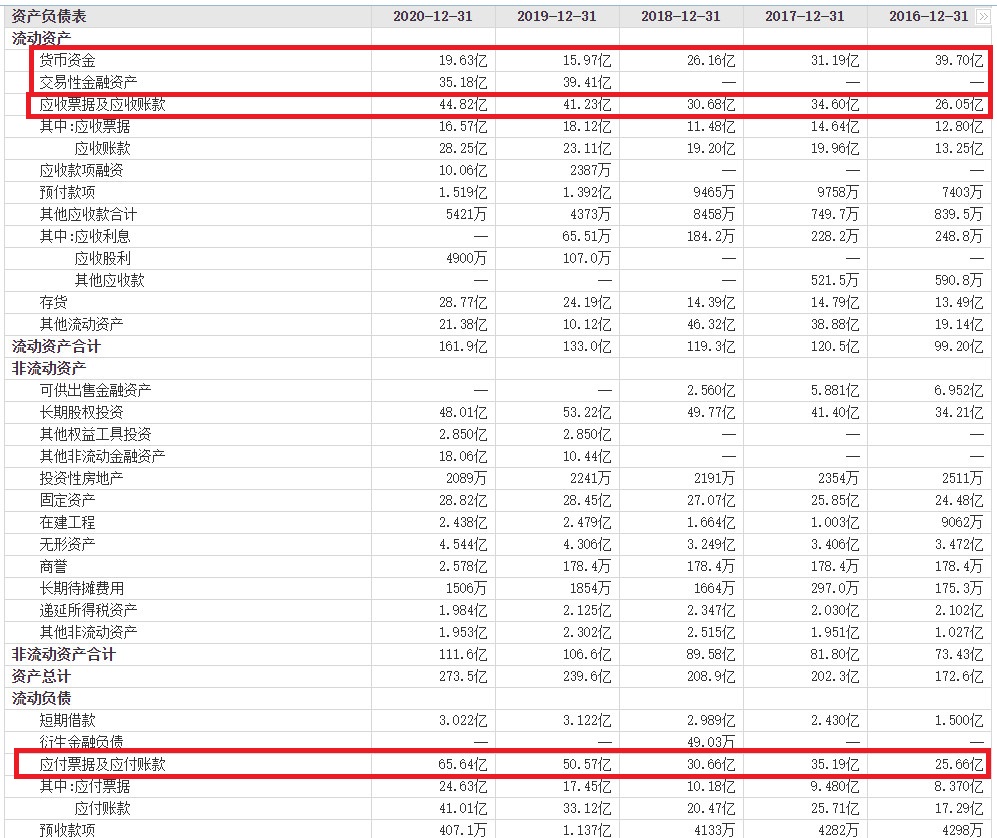 2017年至2020年,公司营收从90.17亿元增加到128.8亿元,增幅42.84%;扣非净利润从23.22亿元降到20.90亿元,降幅9.99%,营收大幅增长扣非净利润却在下降,扣非净利润在2017年达到历史高点。2021年三季报公司营收同比大增24.76%,扣非净利润同比大增22.76%,归属净利润却是同比下降4.50%。存货也从2017年14.79亿元增加到2020年28.77亿元,增幅94.52%,存货增速远大于营收增速。2018年公司开始计提资产减值损失,2018—2020年分别计提资产减值损失2.509亿元、1.695亿元、1.788亿元,2021年三季报计提1.445亿元,这些大额资产减值损失会吞噬公司利润。公司应付账款和应付票据、应收账款和应收票据高企,近五年应付账款和应付票据基本上大于或者等于应收账款和应收票据,且有进一步扩大的趋势,2016年前者除以后者的比例为98.5%,2021年三季报前者除以后者的比例为146.45%。