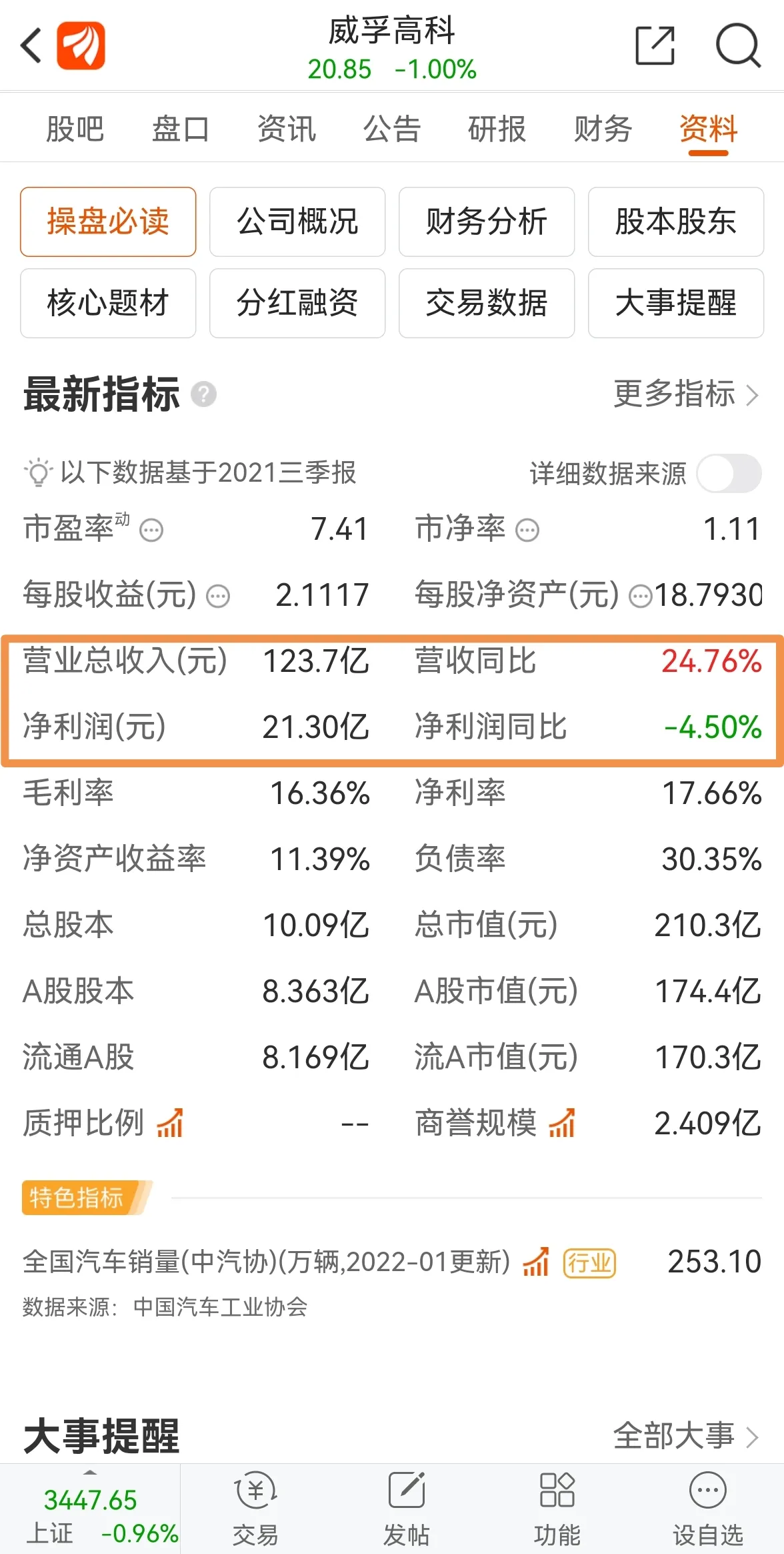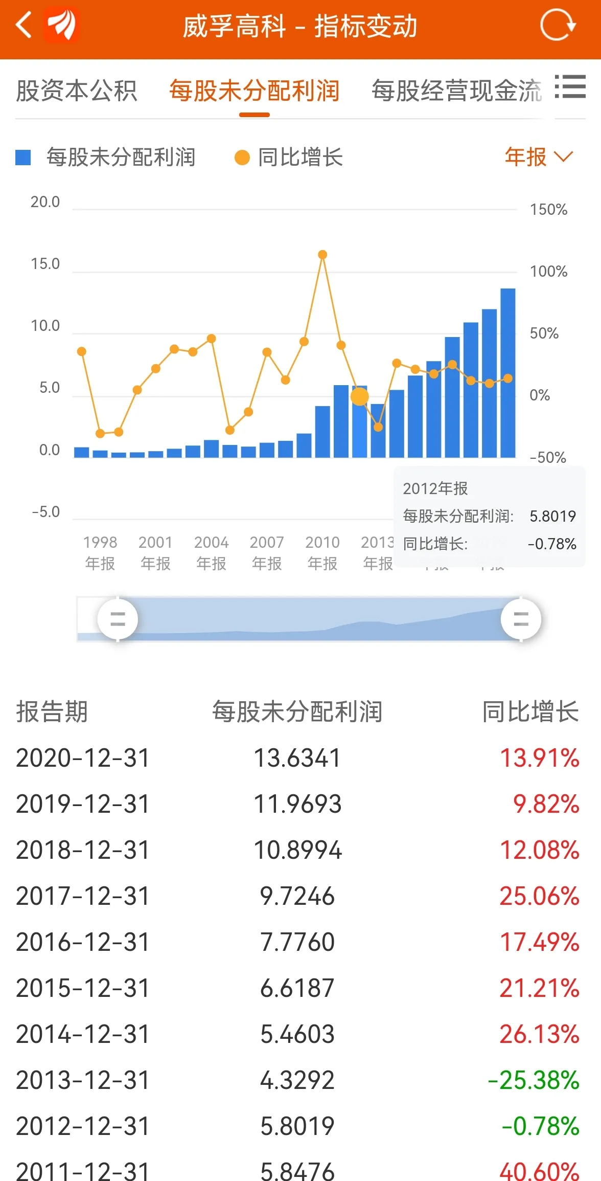 威孚高科,前些年分红并不是特别出众,从2011年度开始,每股现金分红逐渐提高,最近四年每股现金分红分别为1.2元、1.2元、1.1元、1.5元,按3月4日收盘价20.85元计算,连续四年股息率大于5%了。公司每股未分配利润相当高,2021年三季报为14.2475元。