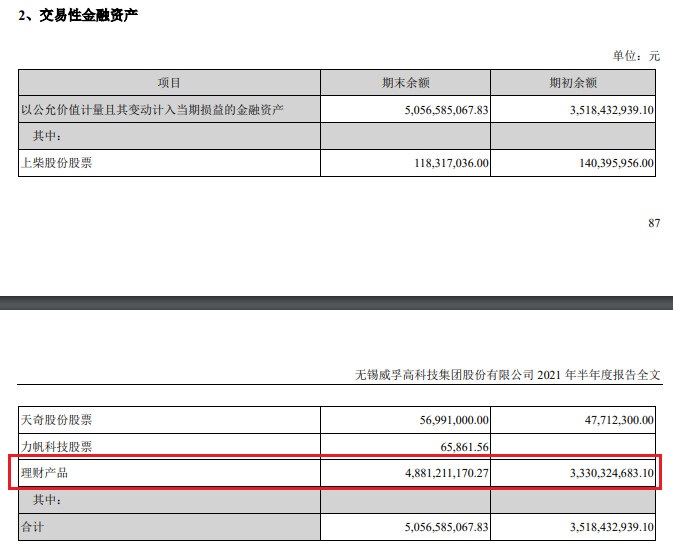 威孚高科有一个比较特殊的现象,从2015年开始公司净利率高于毛利率,原因就在于公司股权投资收益较高,2019年一季度开始出现巨额交易性金融资产,2021年中报交易性金融资产50.57亿元,其中公司自有资金购买的不保本理财产品48.81亿元,公司现金流还是充足。