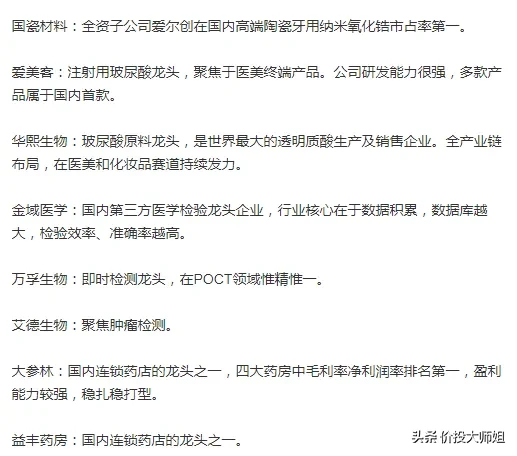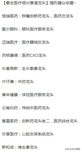 如果你也喜欢价投,不妨多参考以上七点,理解其中精髓,真正做到公司估值等于价值,长线是金。附上医药行业细分领域龙头,熟练这七点后,不难从里面找出适合你的龙头公司,一同起飞!