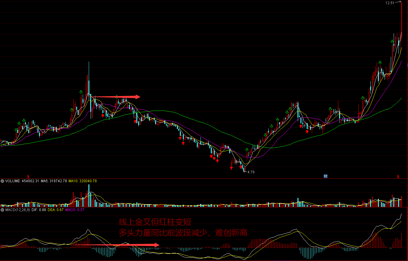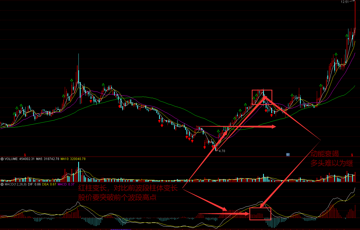 MACD红柱体逐步变短意味着多头力量的减弱,变长意味着多头力量的增强