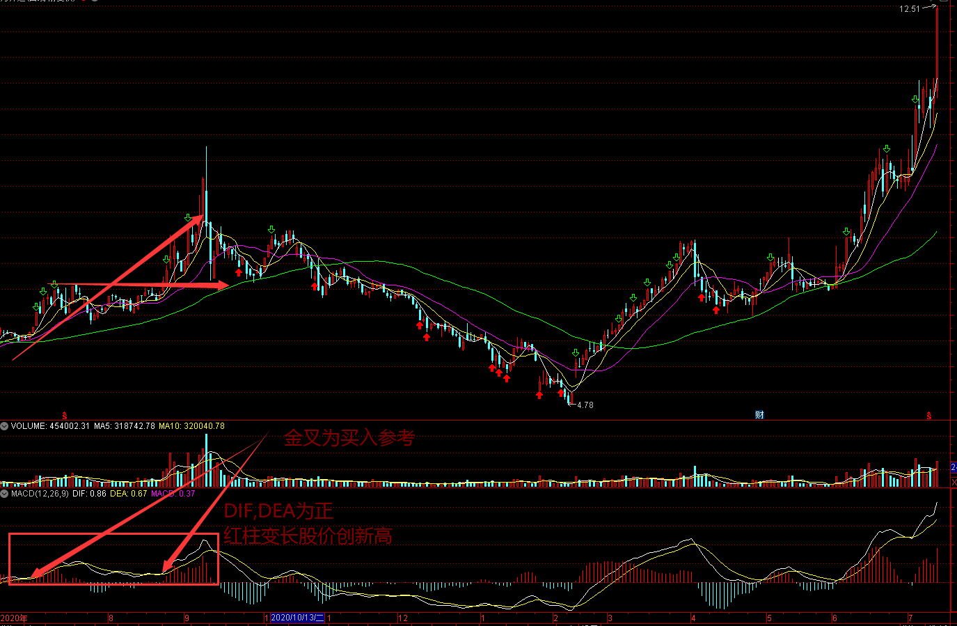 MACD柱体由绿转红,DIF,DEA值由负转正,市场由空头转为多头