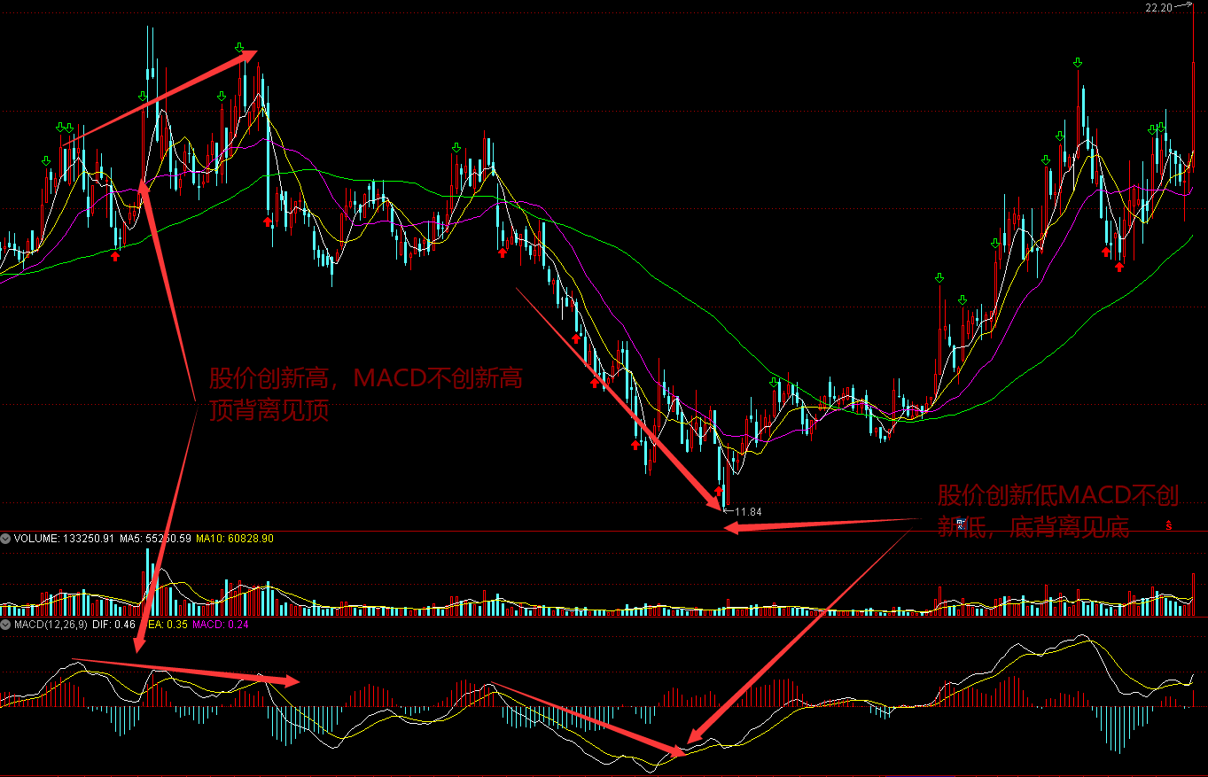 MACD与K线趋势发生背离通常是趋势反转的信号(见图解)