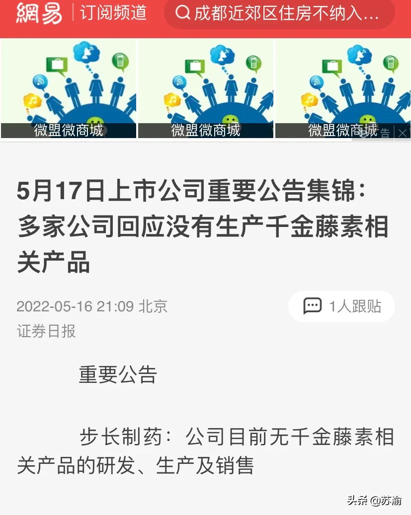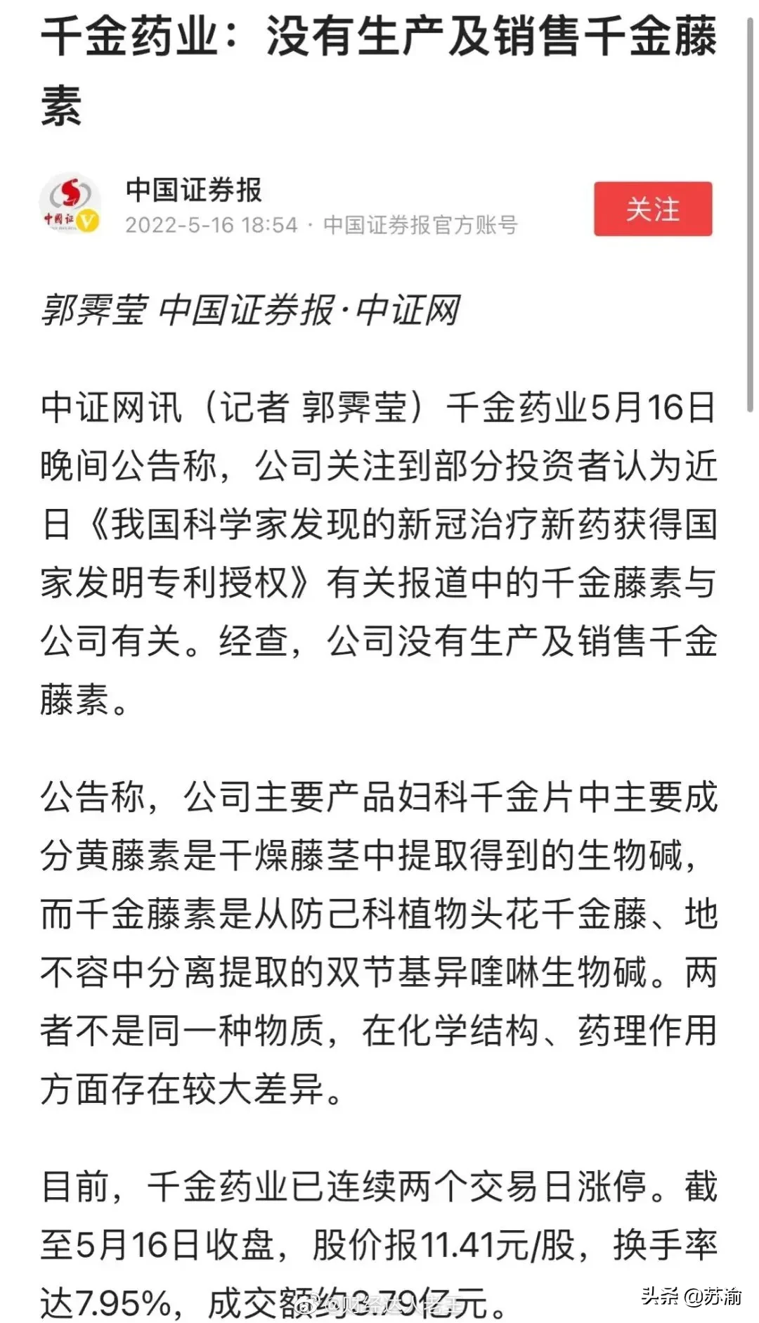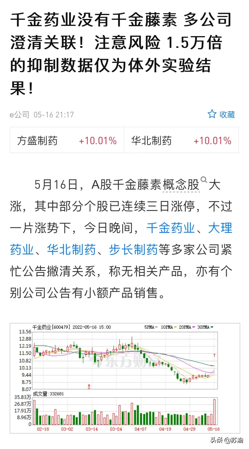 这不,昨晚澄清消息一闷棍打来:连续涨停的千金药业生产的是妇科千金片:中国证券报5月16日报道,连续两个涨停的千金药业今天收盘后发布公告,公司不生产千金藤素,主要产品是妇科千金片,不是一回事。这啪啪打脸炒作的游资,还有跟风的诸多股民,就看谁跑得快了!(见图一)
