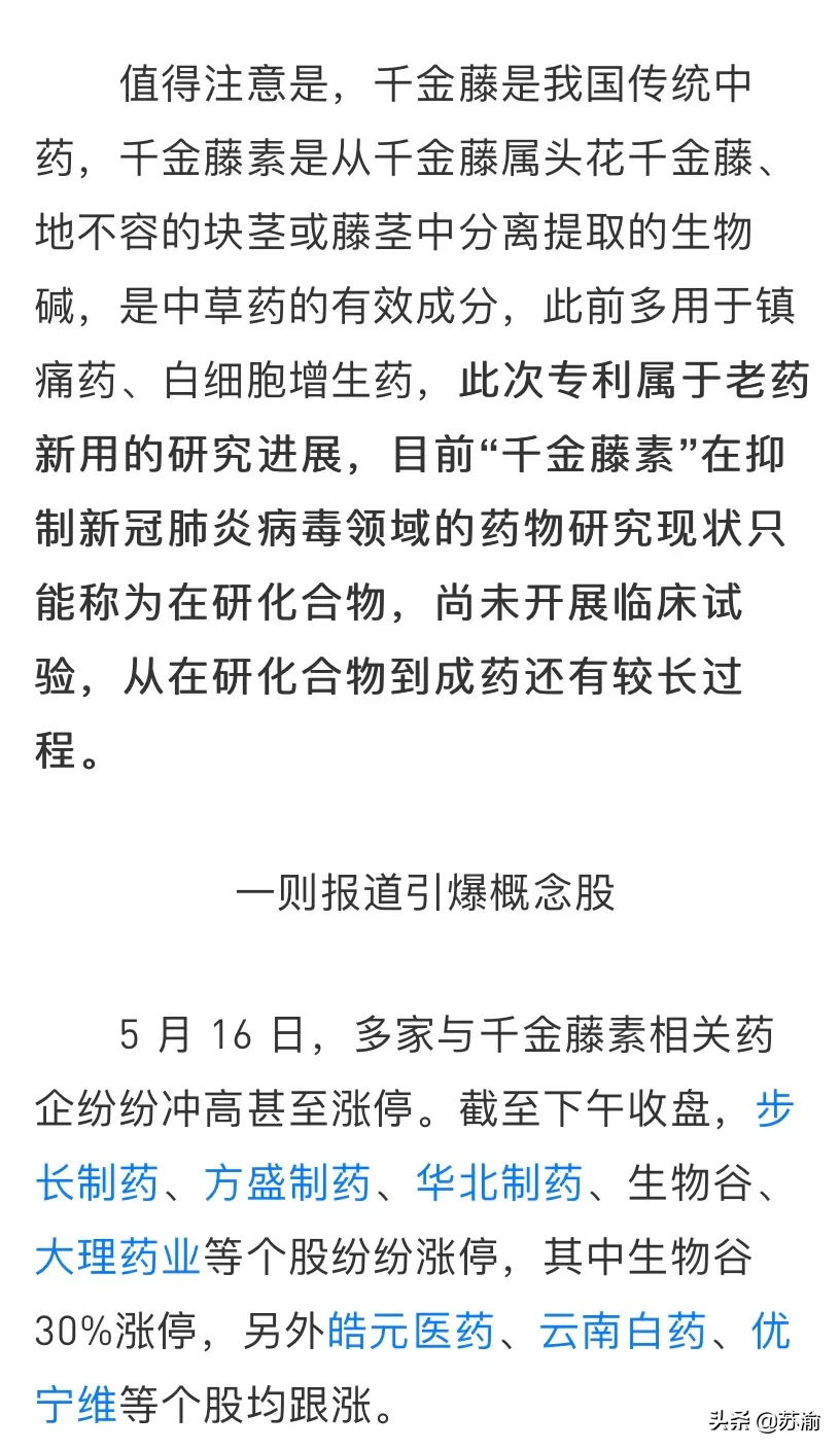 目前,市场上的公司都不生产千金藤素,大多是蹭热点,作为散户要注意风险了。